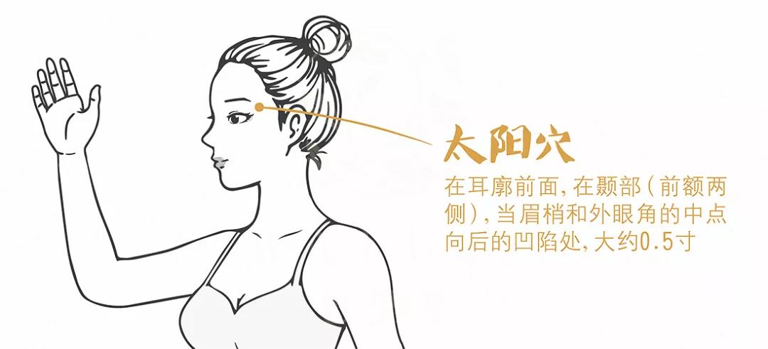 太阳穴为经外奇穴,足少阳胆经、足阳明胃经两条阳经从它周围经过,为火聚之地,因此,取名为“太阳”穴。太阳穴是人头部的重要穴位,当人们长时间连续用脑后,太阳穴往往会出现重压或胀痛的感觉,这就是大脑疲劳的信号。揉按太阳穴可清肝泻火、止痛明目、通经活络、振奋精神。操作方法:用双手中指指腹顺时针或逆时针按揉太阳穴,力度千万不要过大,以免使头痛加剧。