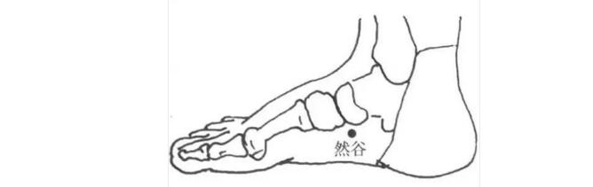 位置:它在足内侧,先找到足内踝尖,在其前下方可以摸到一块隆起的骨头,这个粗隆的下方就是然谷穴了。