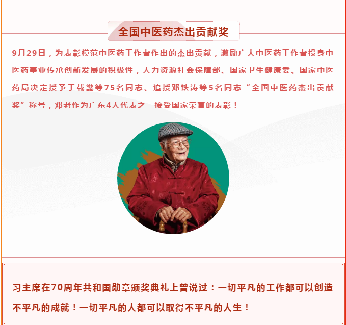 日前,中共中央、国务院、中央军委颁发了“庆祝中华人民共和国成立70周年”纪念章。国医大师邓铁涛教授获颁该纪念章。