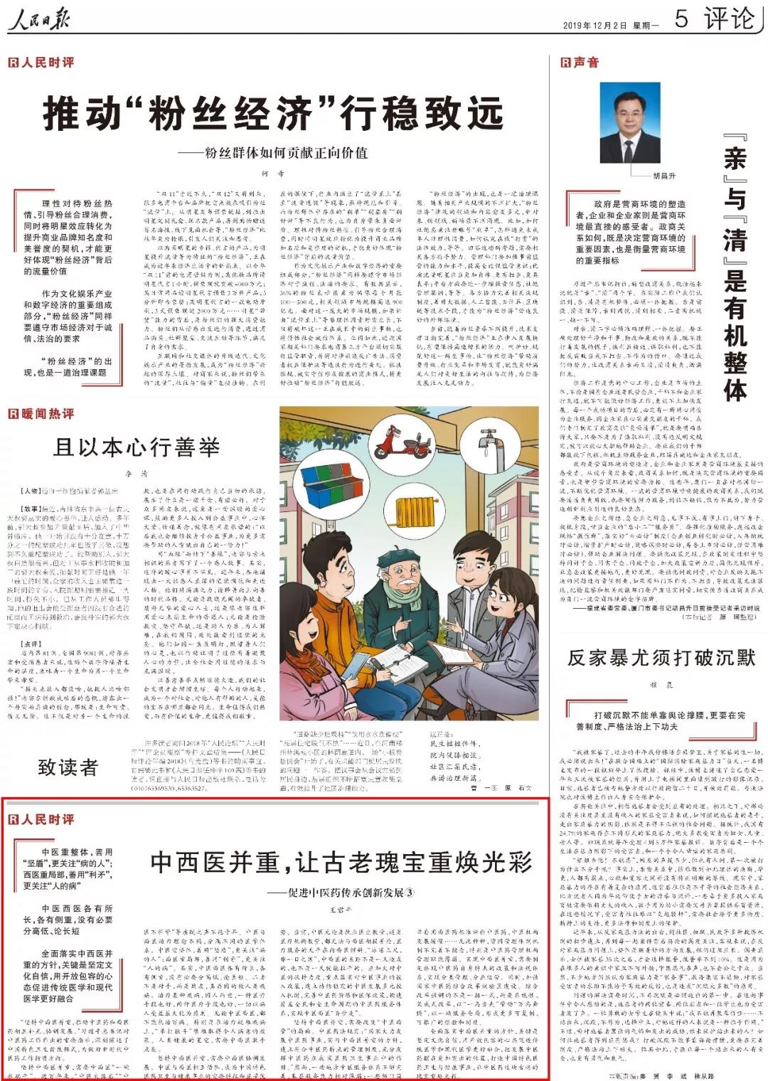 坚持中西医并重,需要中西医“一碗水端平”。近百年来,“中医太落后”“中医不科学”等质疑之声不绝于耳。中医与西医治疗理念不同,分属不同的医学体系。中医重整体,善用“坚盾”,更关注“病的人”;西医重局部,善用“利矛”,更关注“人的病”。其实,中医西医各有所长,各有侧重,没有必要分高低、论长短。二者不是对手,而是战友,其共同的敌人是疾病。治疗某种疾病,因人而宜,一种医疗手段也好,两种医疗手段也好,一切以病人受益最大化为原则。无论中医西医,都不能包治百病。特别是在治疗疑难疾病上,“单打独斗”很难取得令人满意的效果。人类健康的星空,需要中西医联手点亮。