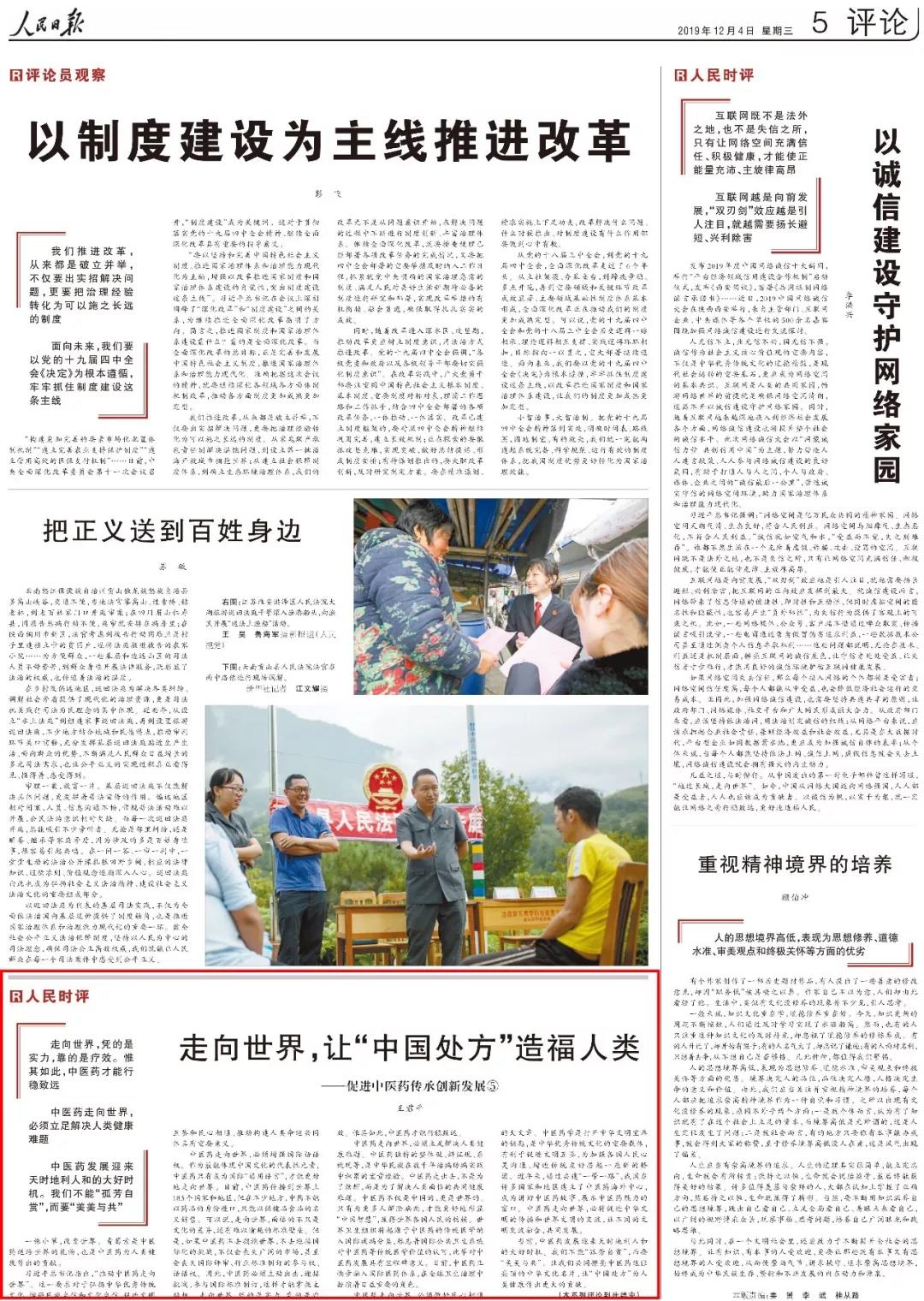 当前,中医药发展迎来天时地利人和的大好时机。我们不能“孤芳自赏”,而要“美美与共”。让我们共同擦亮中医药这张亮丽的中华文化名片,让“中国处方”为人类健康作出更大的贡献。