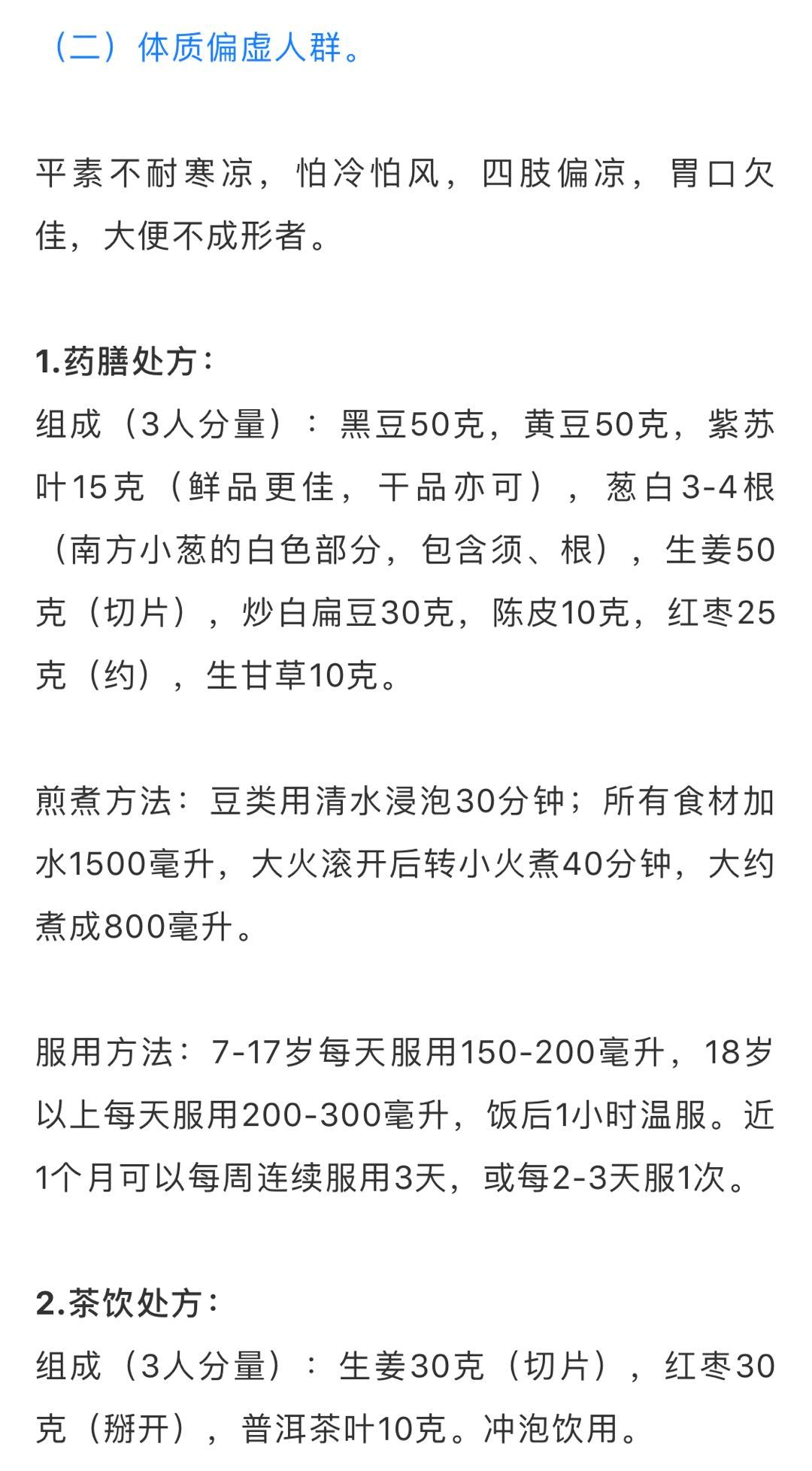 4、本方案仅用于大众人群作为调理、预防使用,不能用于患病后的治疗。如出现发热、咳嗽、流涕等感冒症状,请到医院作进一步诊疗。