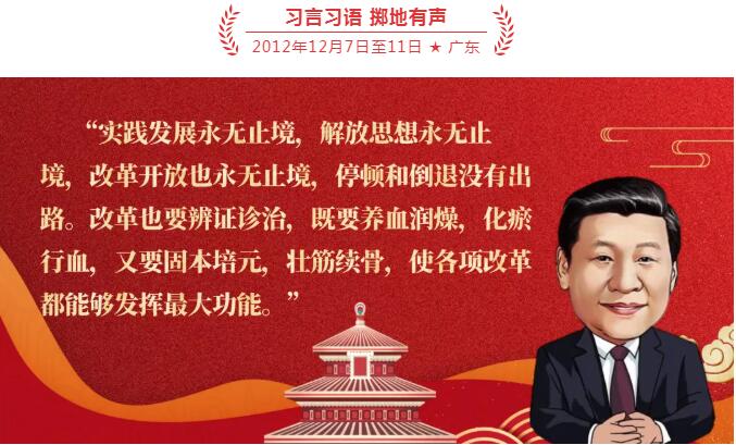 2012年12月7日至11日,习近平在广东考察工作时指出:“实践发展永无止境,解放思想永无止境,改革开放也永无止境,停顿和倒退没有出路。改革也要辨证诊治,既要养血润燥,化瘀行血,又要固本培元,壮筋续骨,使各项改革都能够发挥最大功能。”