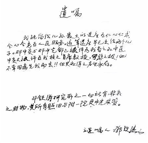 临终前,邓老叮嘱家人要帮他交最后一笔党费。2019年1月10日6时6分,邓老仙逝。其生前亲手写的遗嘱开封,老人家在遗嘱中写道:“我能留给儿孙最大的遗产为仁心仁术,全心全意为人民服务。”邓老把仁心仁术和全心全意为人民服务融入了他作为一个共产党员的行为准则中。