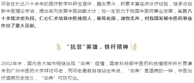 邓铁涛教授,出身于岭南中医世家,八十余年医术沉淀,为广州中医药大学终身教授,博士生导师。是卫生部、人力资源部和社会保障部、国家中医药管理局等国家三部委联合评定为新中国首批“国医大师”。