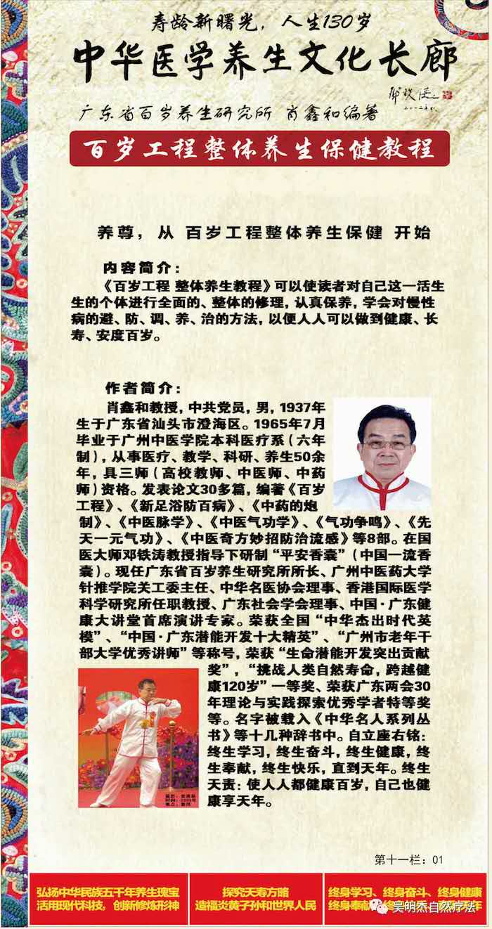 总导师国医大师邓铁涛教授,创始人肖鑫和教授总编,百岁工程全套课程是对自己个体进行全面的、整体的修理,认真保养,学会对慢性病症的避、防、调、养、治的方法,以便人人可以做到健康、长寿,安度百岁。