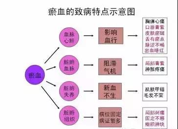 脸色灰暗,脸上会有黑斑,这种黑斑最集中反应到眼眶周围,眼眶周围会黑。越到冬天皮肤越干,一块一块的起皮。很多女性一到冬天腿上皮肤像鱼鳞一样,中医管这个叫肌肤甲错,像铠甲一样错落有致。美容院会建议皮肤补水,这不是解决根问题的方法,解决根本问题应该把瘀血通开,让液体能够过滤到体表。皮肤上会有红色或青色的毛细血管浮起,大家观察一下,你们见没见过这样的人,鼻子和鼻翼两侧上全是红血丝的,判断这个人是不是经常喝酒,红血丝严重了,让他到医院检查是不是有肝硬化。我碰到几位最后因为肝硬化去世,说明体内瘀血严重,有的女性脸上有红血丝,血丝很明显,好多血丝浮起,这种女性往往是有瘀血的表现。5、有的人会有疼痛的地方,这种疼痛是固定的,不是串着疼的。这种疼痛是晚上重白天轻。我教大家一个中医经验,任何疼痛如果晚上重白天轻的话,这种疼痛要高度怀疑是瘀血导致的。比如你长了疮晚上重白天轻,你都要先化淤,一边化淤一边解毒才有效,否则单化淤或者单解毒没有效。