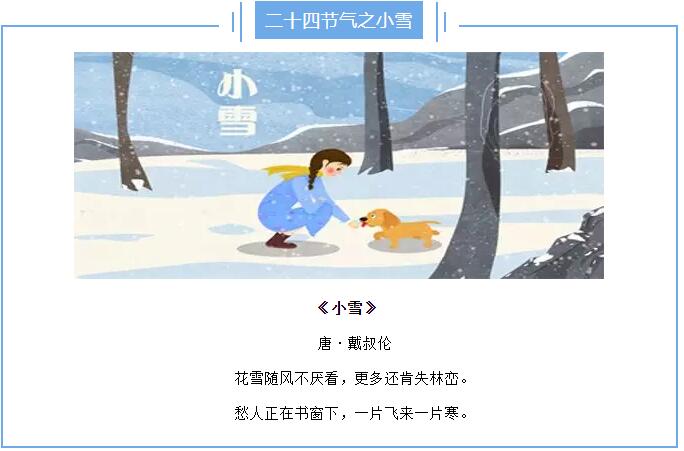 《月令七十二候集解》有曰:“10月中,雨下而为寒气所薄,故凝而为雪。小者未盛之辞。”这个时期天气逐渐变冷,黄河中下游平均初雪期基本与小雪节令一致。虽然开始下雪,一般雪量较小,并且夜冻昼化。